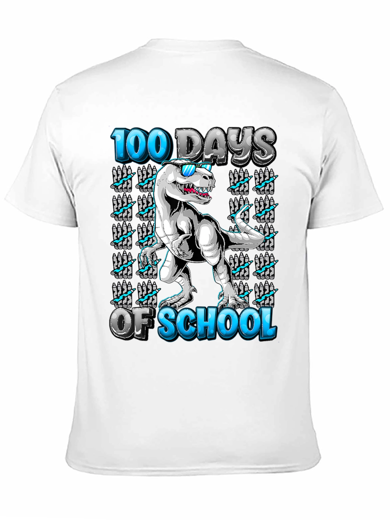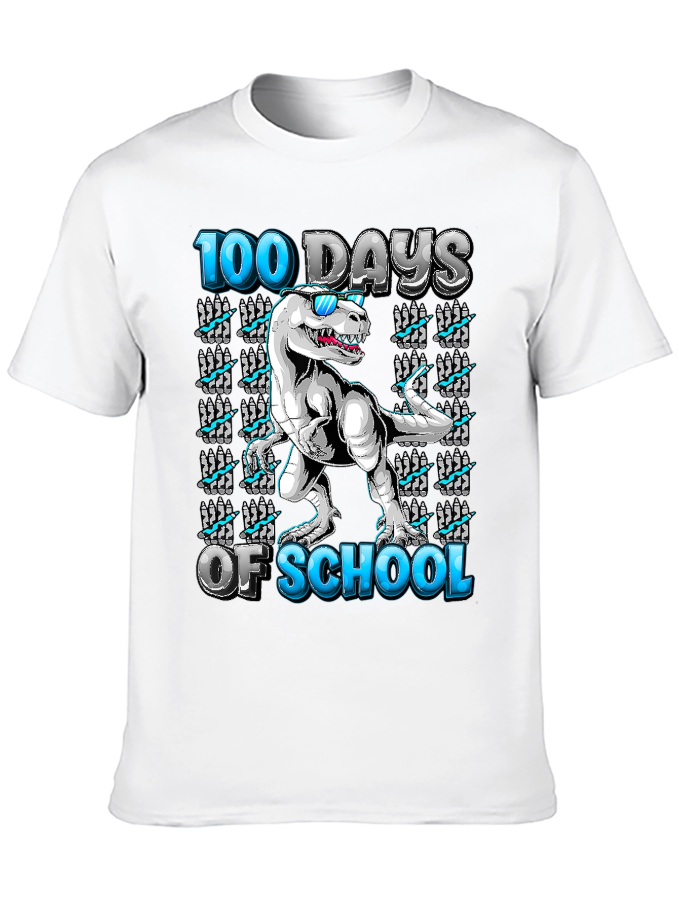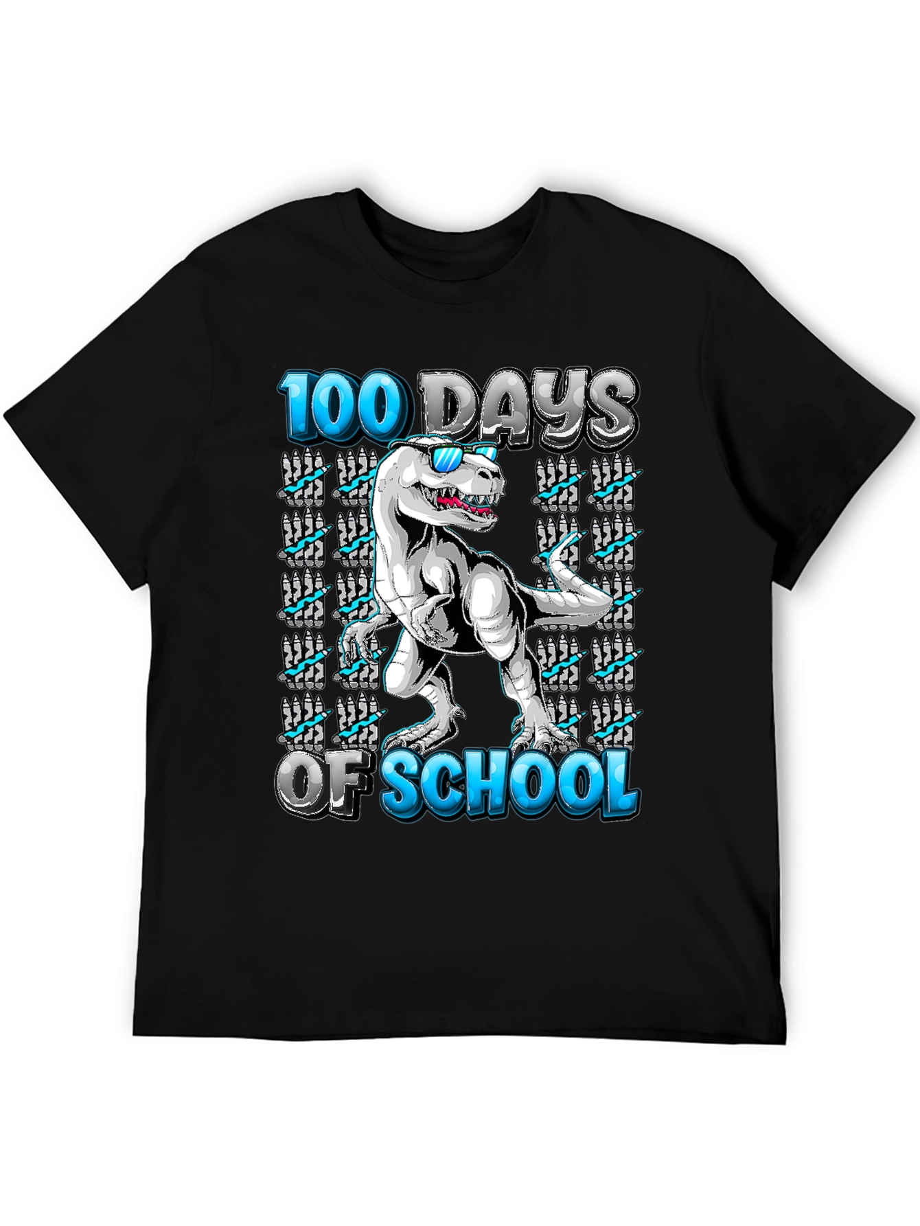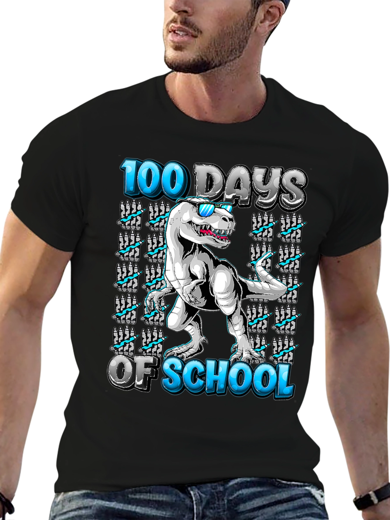 Celebrate 100 days of learning with this fun black t-shirt. The tee features a cool dinosaur graphic wearing sunglasses, surrounded by a pattern of pencils, with '100 Days of School' text design. Made from a comfortable-looking material, this shirt is perfect for students and teachers. Wear it to school events, class parties, or as a fun everyday outfit. A great way to show off school pride and celebrate a milestone in education.