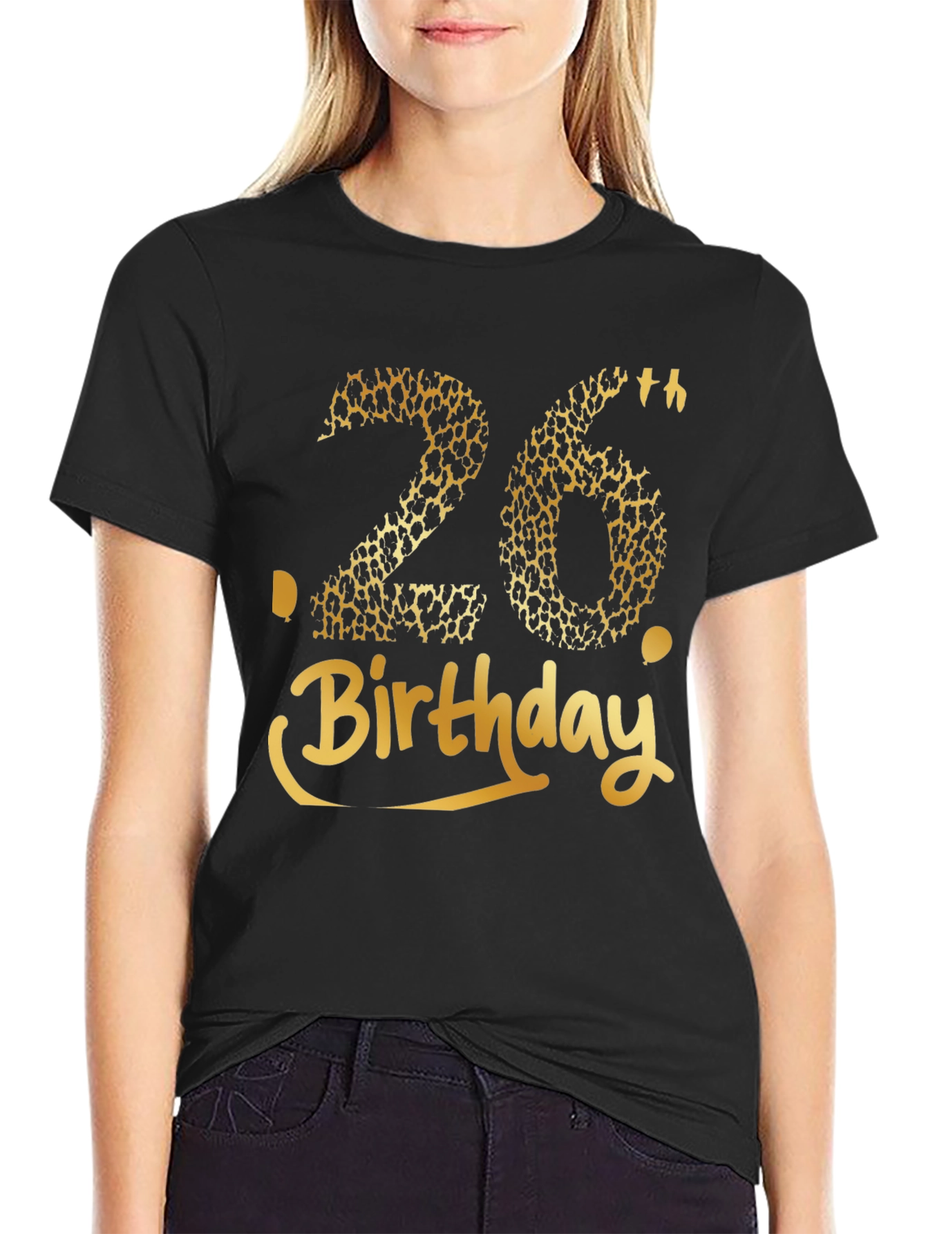 Celebrate your 26th birthday in style with this eye-catching graphic tee! The bold "26th" design features a trendy leopard print pattern, adding a touch of wild flair to your special day. "Birthday" is written in stylish gold script. Made from a comfortable, breathable black material, this tee is perfect for birthday parties, casual outings, or as a memorable gift. Show off your unique style and make a statement with this fun and festive birthday shirt! Get yours today and make your 26th birthday unforgettable.