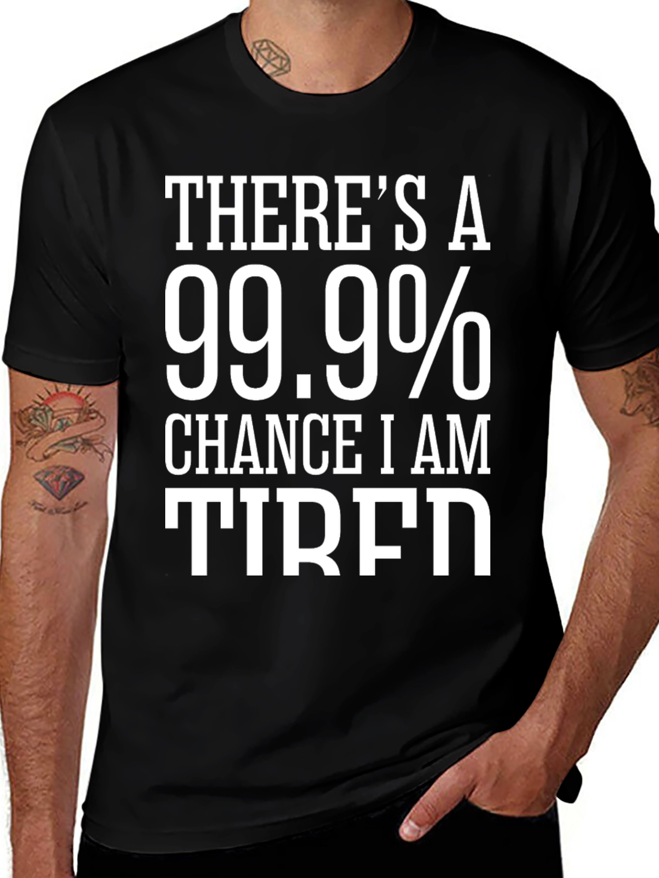 Express your perpetual state of weariness with this humorous black t-shirt. The bold white text declares "THERE'S A 99.9% CHANCE I AM TIRED," making it a relatable statement piece. Perfect for casual wear, lounging at home, or those days when you just can't muster the energy for anything else. Crafted from comfortable materials, this shirt is both stylish and cozy. It's a great conversation starter and a fun way to show off your sense of humor.