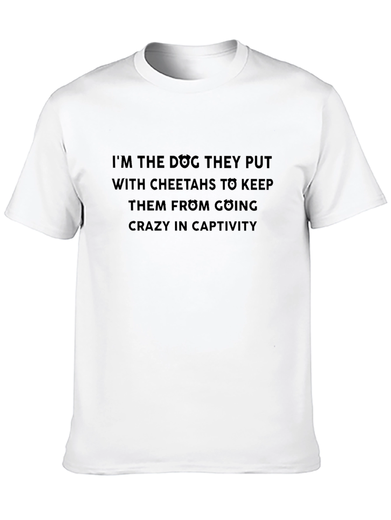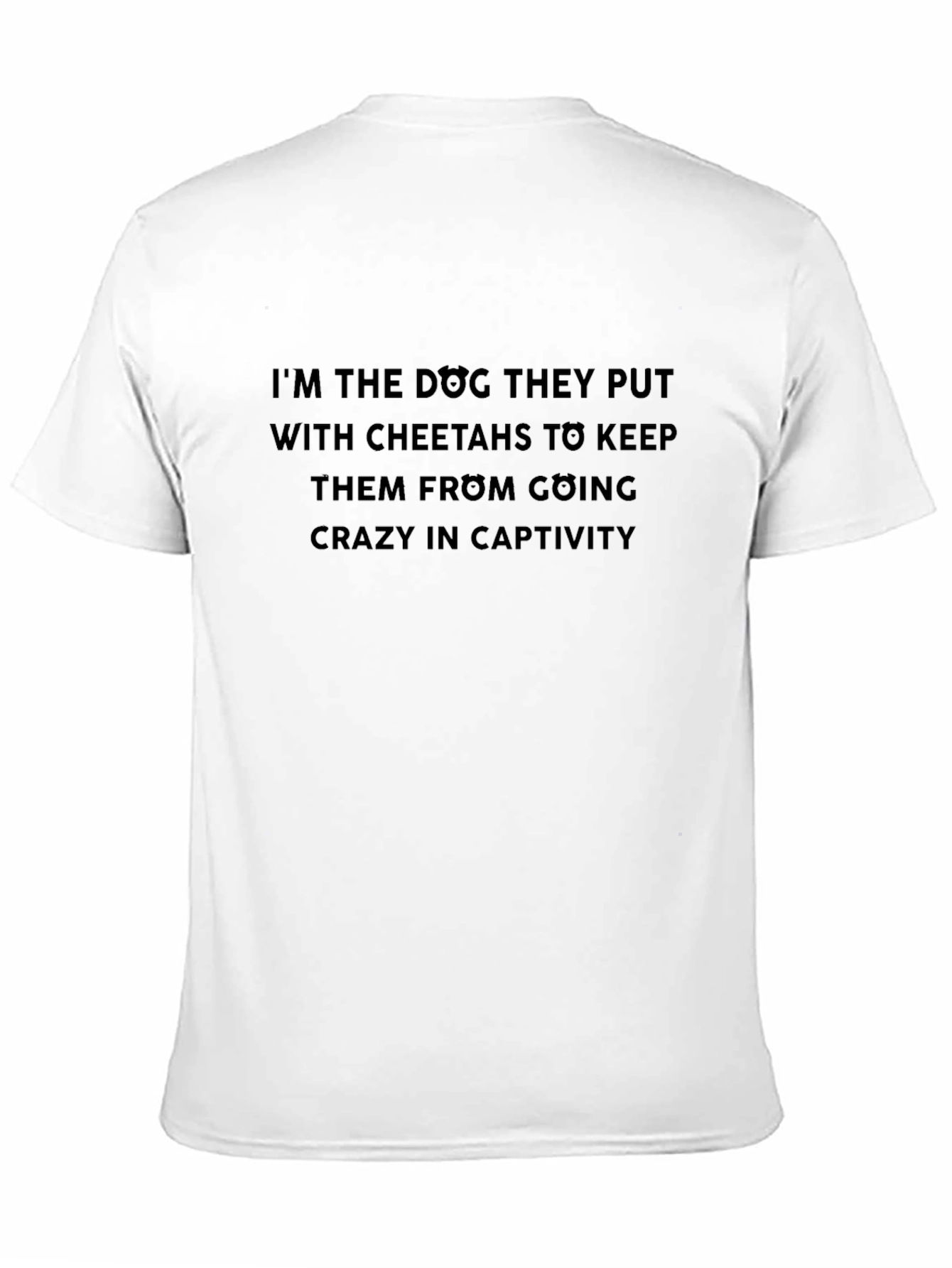 This black t-shirt features a unique and humorous design, perfect for animal lovers. Made from a comfortable-looking material, the tee displays the statement "I'M THE DOG THEY PUT WITH CHEETAHS TO KEEP THEM FROM GOING CRAZY IN CAPTIVITY". The shirt has a classic fit with short sleeves. This t-shirt is a great conversation starter and is ideal for casual outings, animal shelter visits, or just lounging around at home. Show off your unique sense of humor and love for animals with this eye-catching t-shirt. It's sure to be a hit with friends and family!