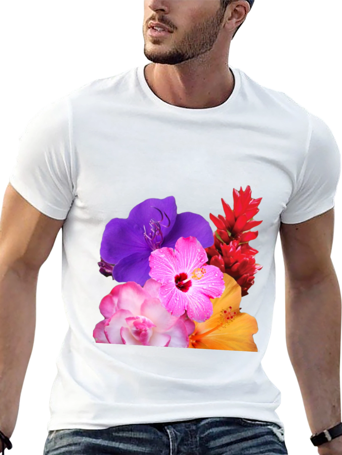 Elevate your casual wardrobe with this striking black t-shirt featuring a vivid floral print. The design showcases a beautiful medley of blossoms in a range of eye-catching colors including pink, red, purple, and yellow, creating a captivating visual display. Made from a soft and comfortable fabric, this tee offers a relaxed fit for all-day wear. Perfect for adding a pop of color to your everyday look, wear it with jeans for a relaxed vibe, or dress it up with a skirt for a more polished style. Ideal for warm weather or casual outings, this floral t-shirt is sure to turn heads.