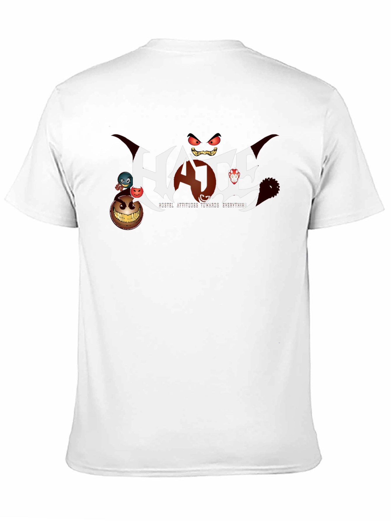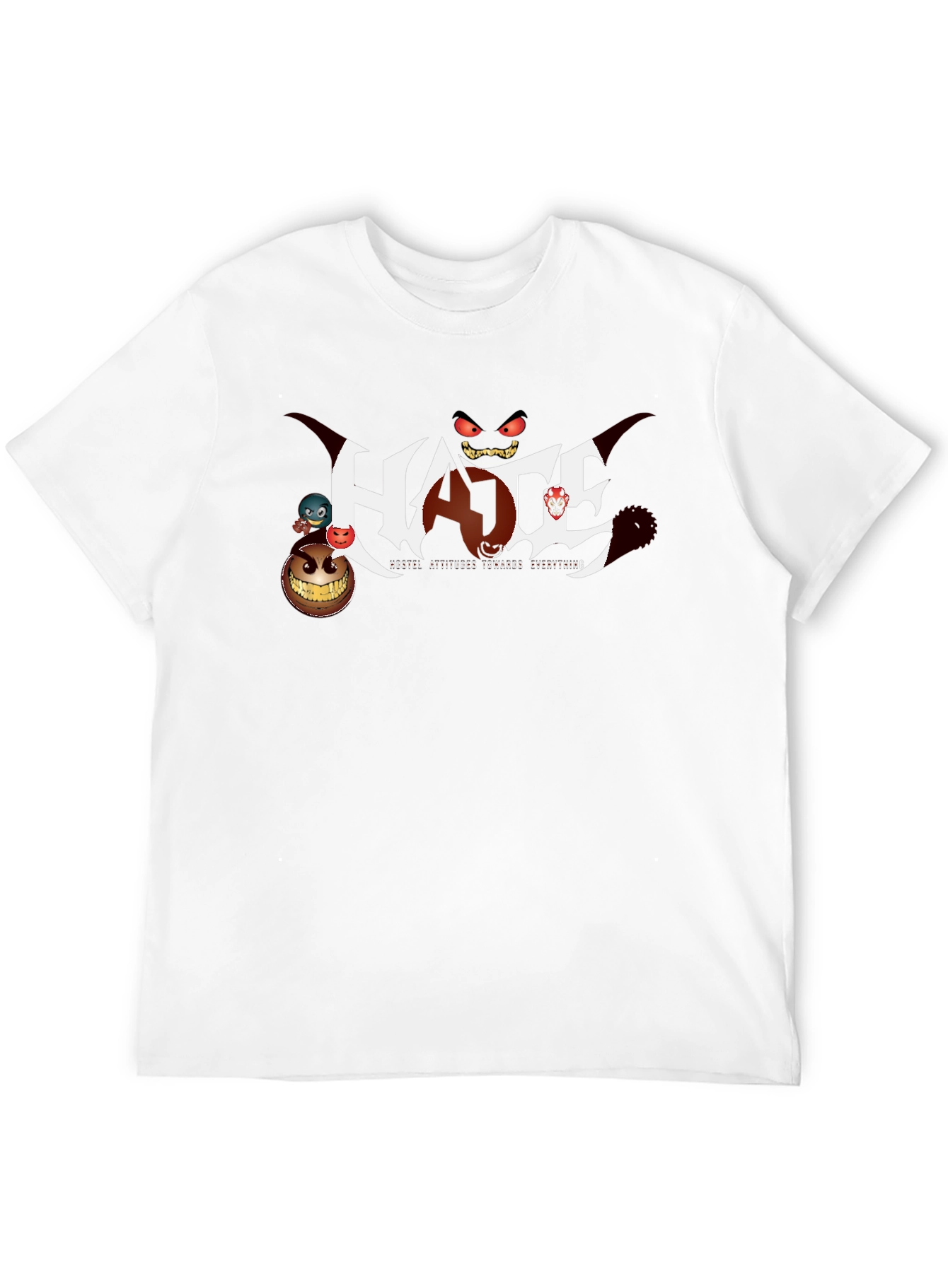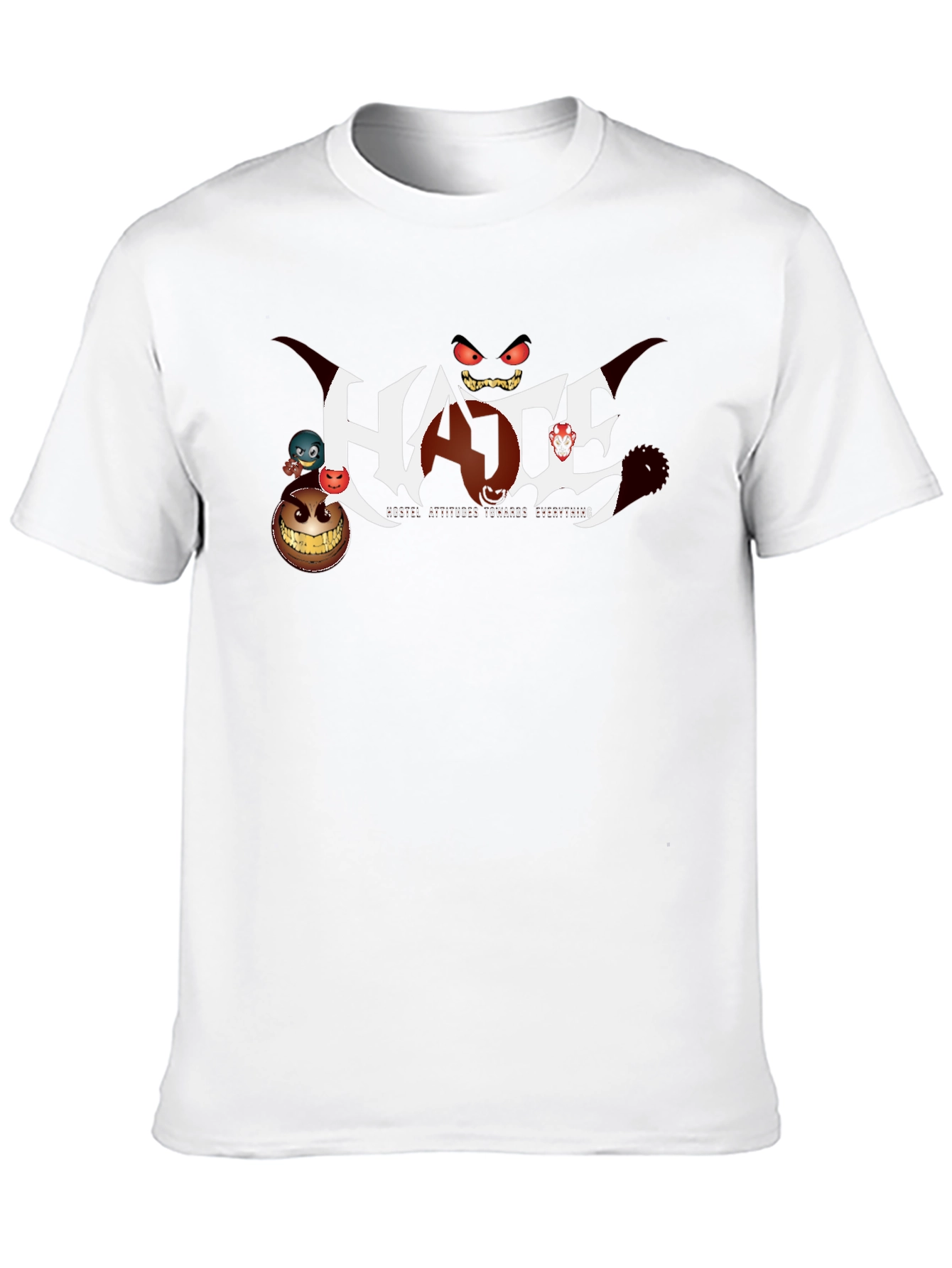 This striking black t-shirt features a bold graphic print. The design incorporates the word "HATE" with playful yet edgy cartoonish elements. A menacing face lurks above the word, while smaller devilish characters add a touch of mischief. Beneath the title, "HOSTILE ATTITUDES TOWARDS EVERYTHING" is boldly printed. The t-shirt has a classic fit with short sleeves and a comfortable crew neck, made with a cotton or cotton blend material. Ideal for those who appreciate bold, graphic designs and want to express a rebellious attitude, this t-shirt is perfect for casual outings, concerts, or making a statement wherever you go.