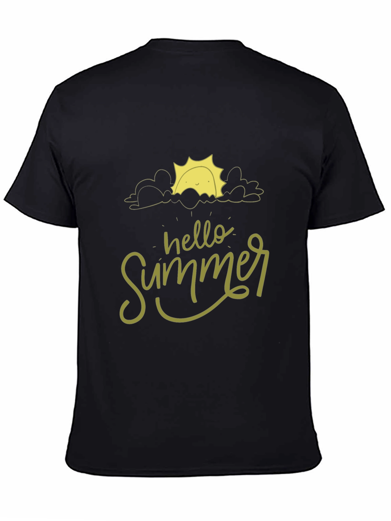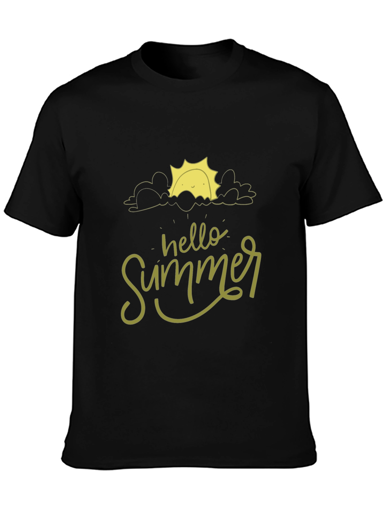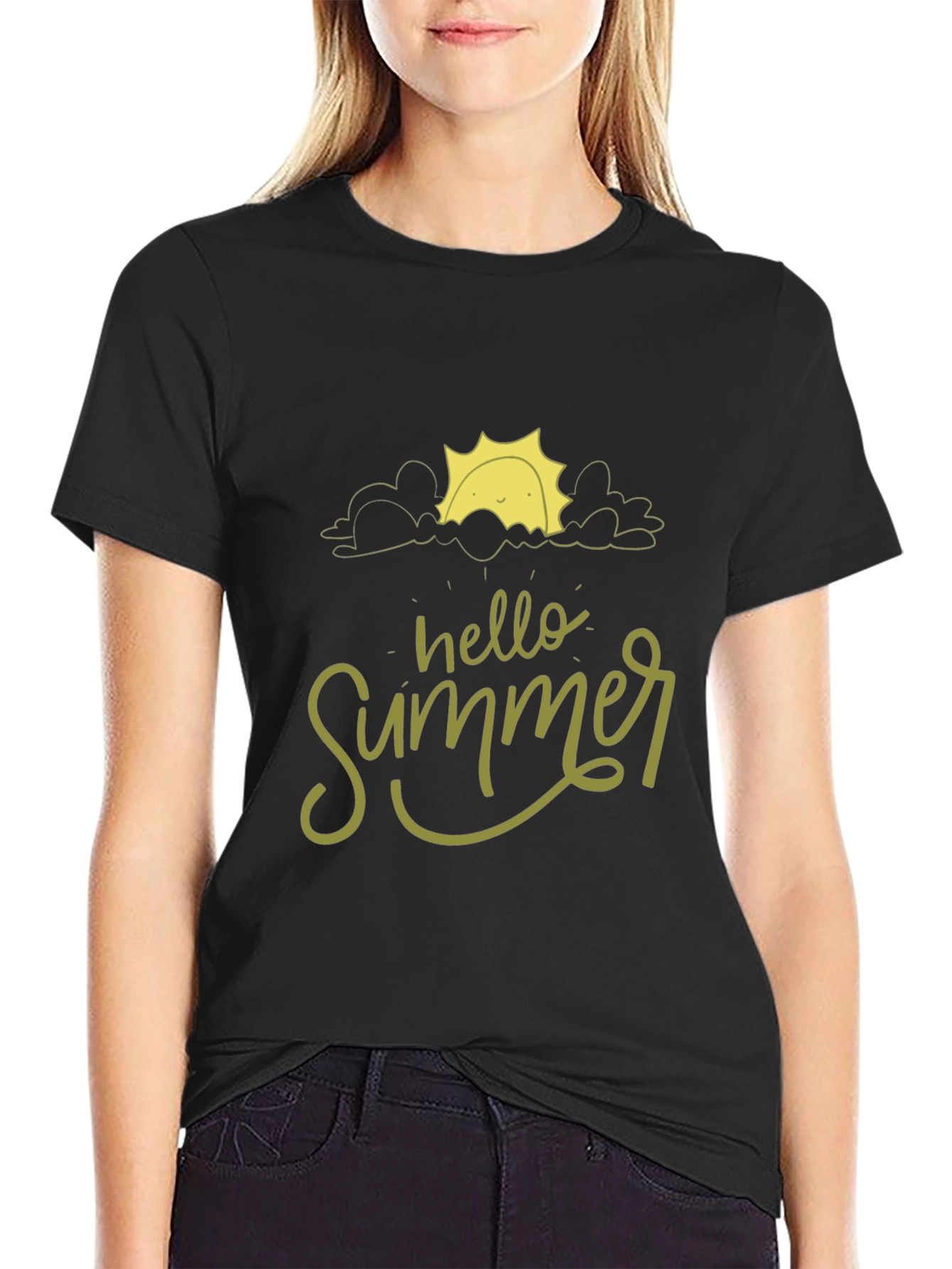 Embrace the warmth of summer with this stylish black T-shirt. Featuring a playful design with a smiling sun peeking from behind clouds and the words "hello summer" in a flowing script, this tee brings a touch of fun to your casual wardrobe. Crafted from comfortable fabric, it's perfect for everyday wear, beach trips, or summer parties. The classic fit ensures a flattering silhouette, while the unique graphic makes a statement. Pair it with shorts, jeans, or a skirt for a cool and casual look. Get ready to soak up the sun in style!
