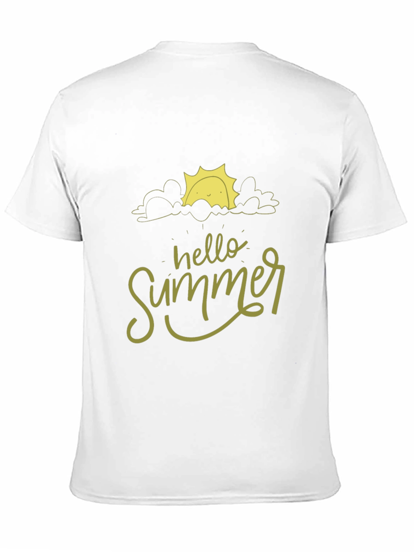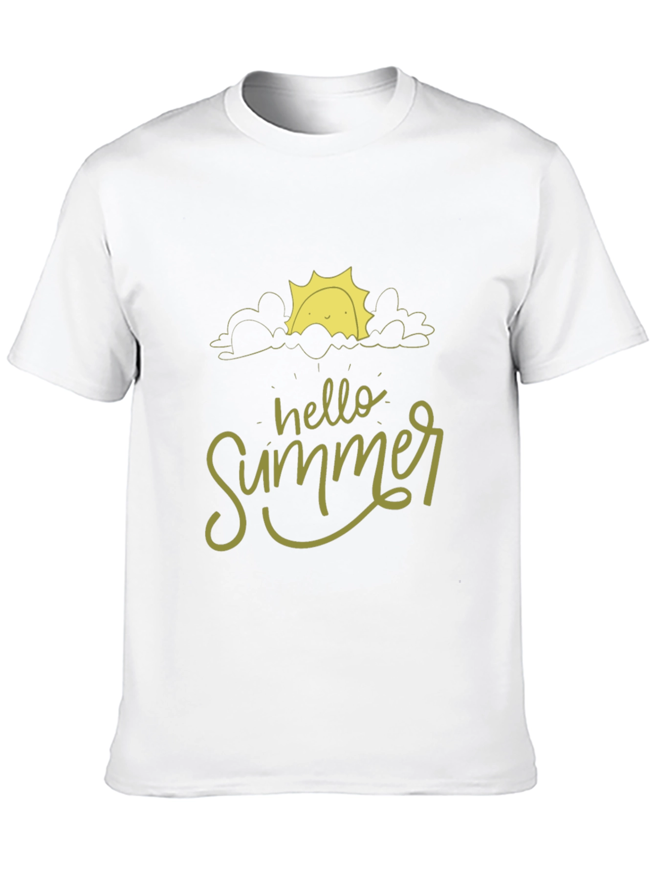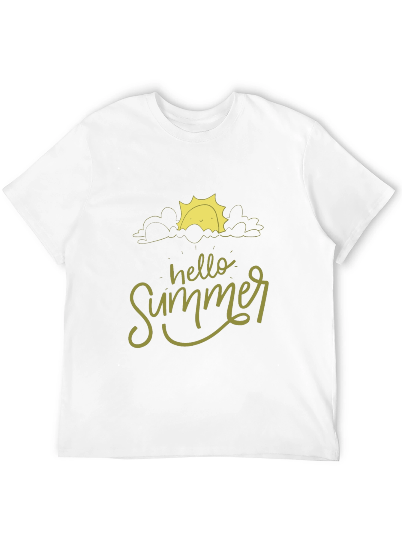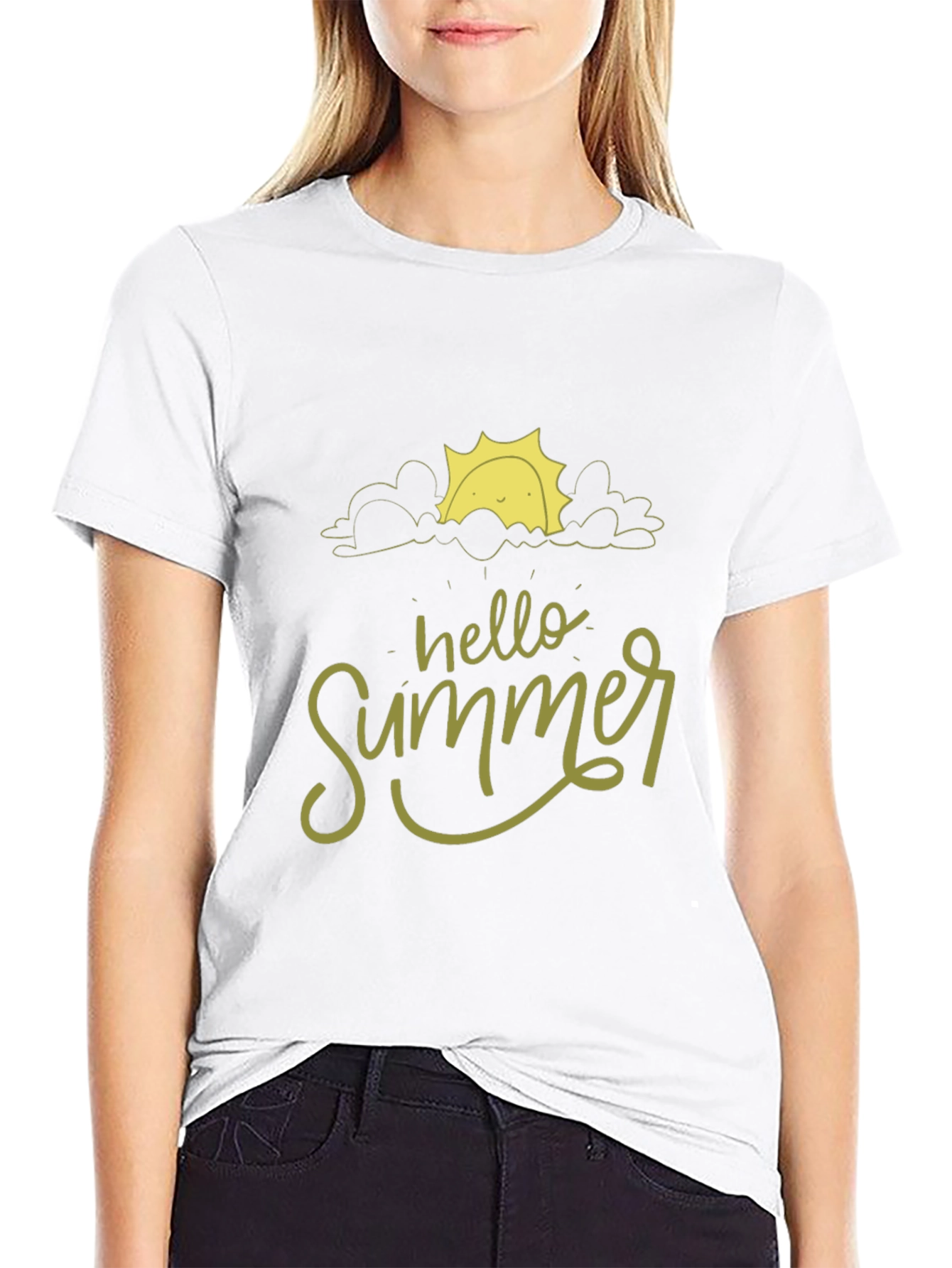 Embrace the warmth of summer with this stylish black T-shirt. Featuring a playful design with a smiling sun peeking from behind clouds and the words "hello summer" in a flowing script, this tee brings a touch of fun to your casual wardrobe. Crafted from comfortable fabric, it's perfect for everyday wear, beach trips, or summer parties. The classic fit ensures a flattering silhouette, while the unique graphic makes a statement. Pair it with shorts, jeans, or a skirt for a cool and casual look. Get ready to soak up the sun in style!