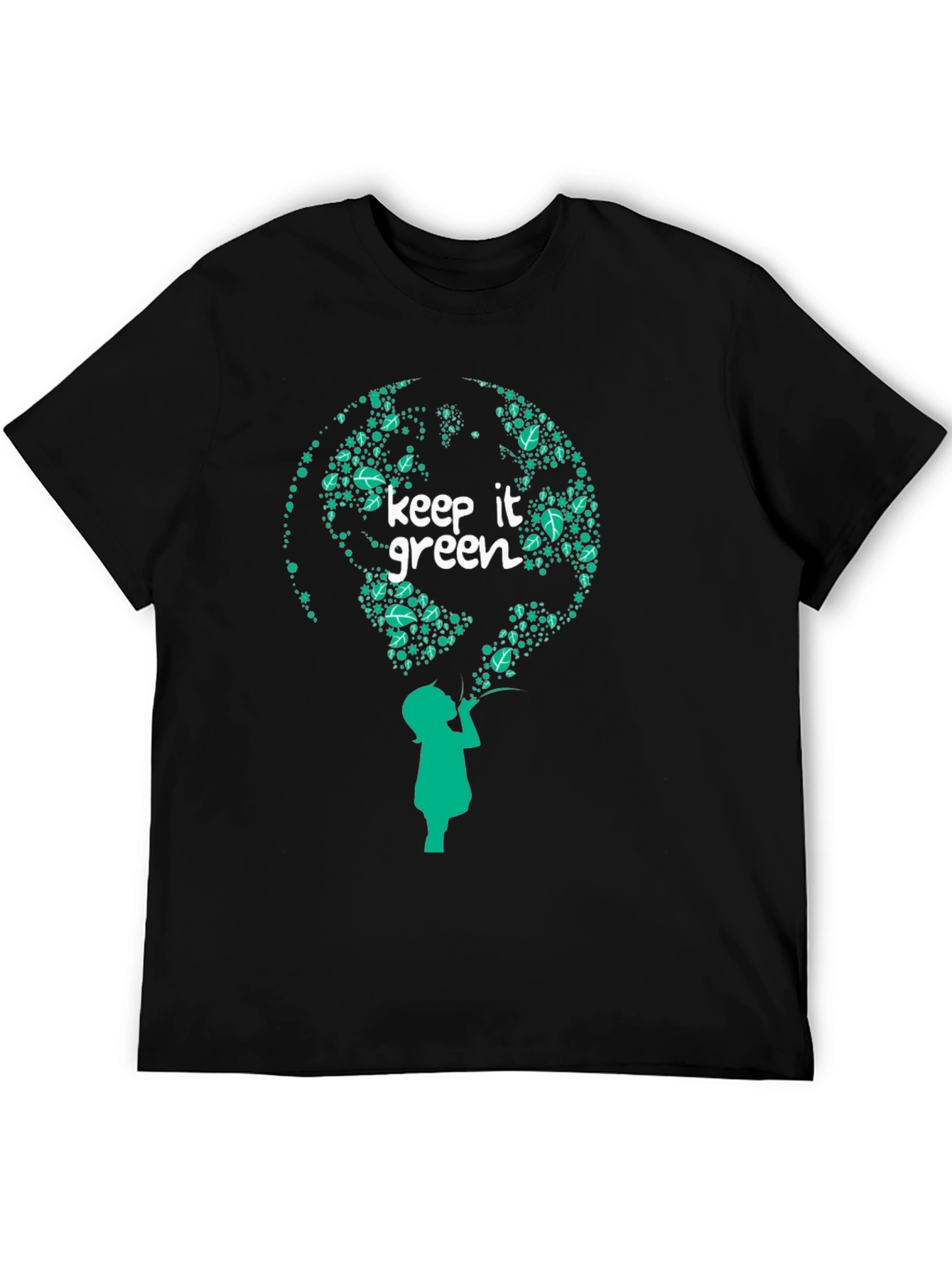 Show your love for the planet with this stylish black graphic tee. The design features a unique, green-toned image of a child blowing bubbles that transform into the Earth. The text "Keep It Green" is integrated into the artwork. Made from a comfortable fabric, this t-shirt is perfect for everyday wear and makes a statement about environmental consciousness. Wear it to school, casual events, or while exploring nature. A great way to promote sustainability and showcase your commitment to protecting our planet. Get yours today!
