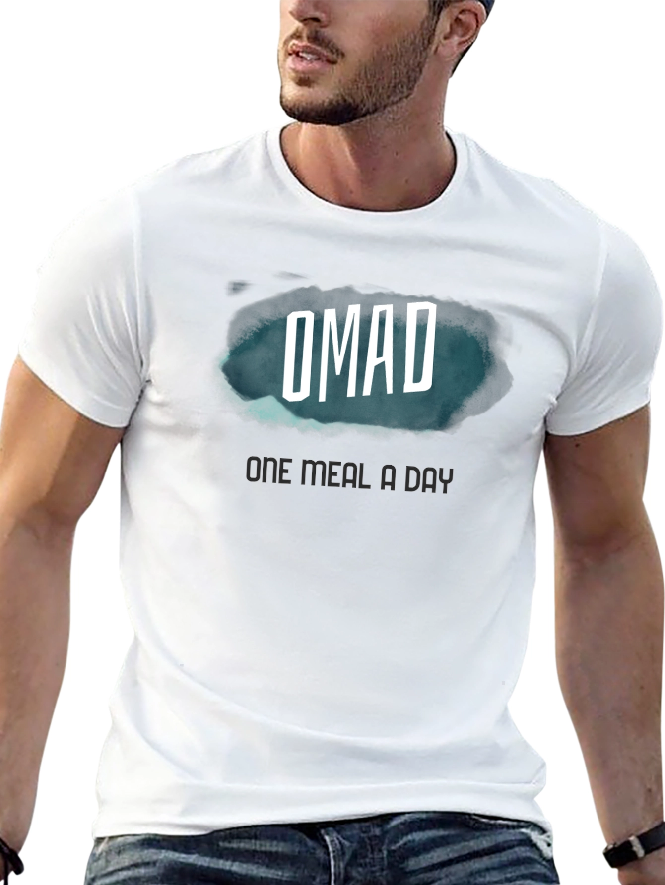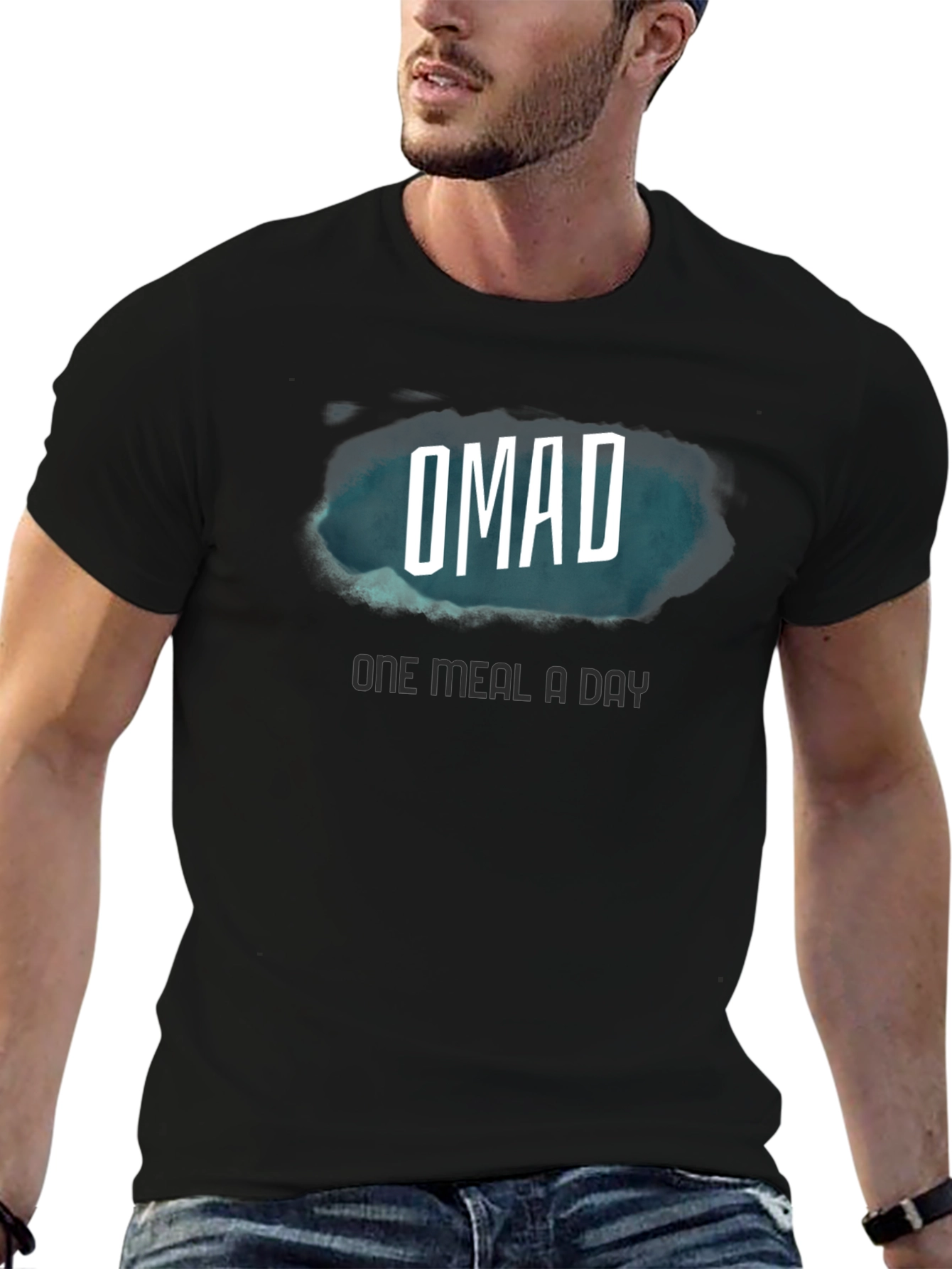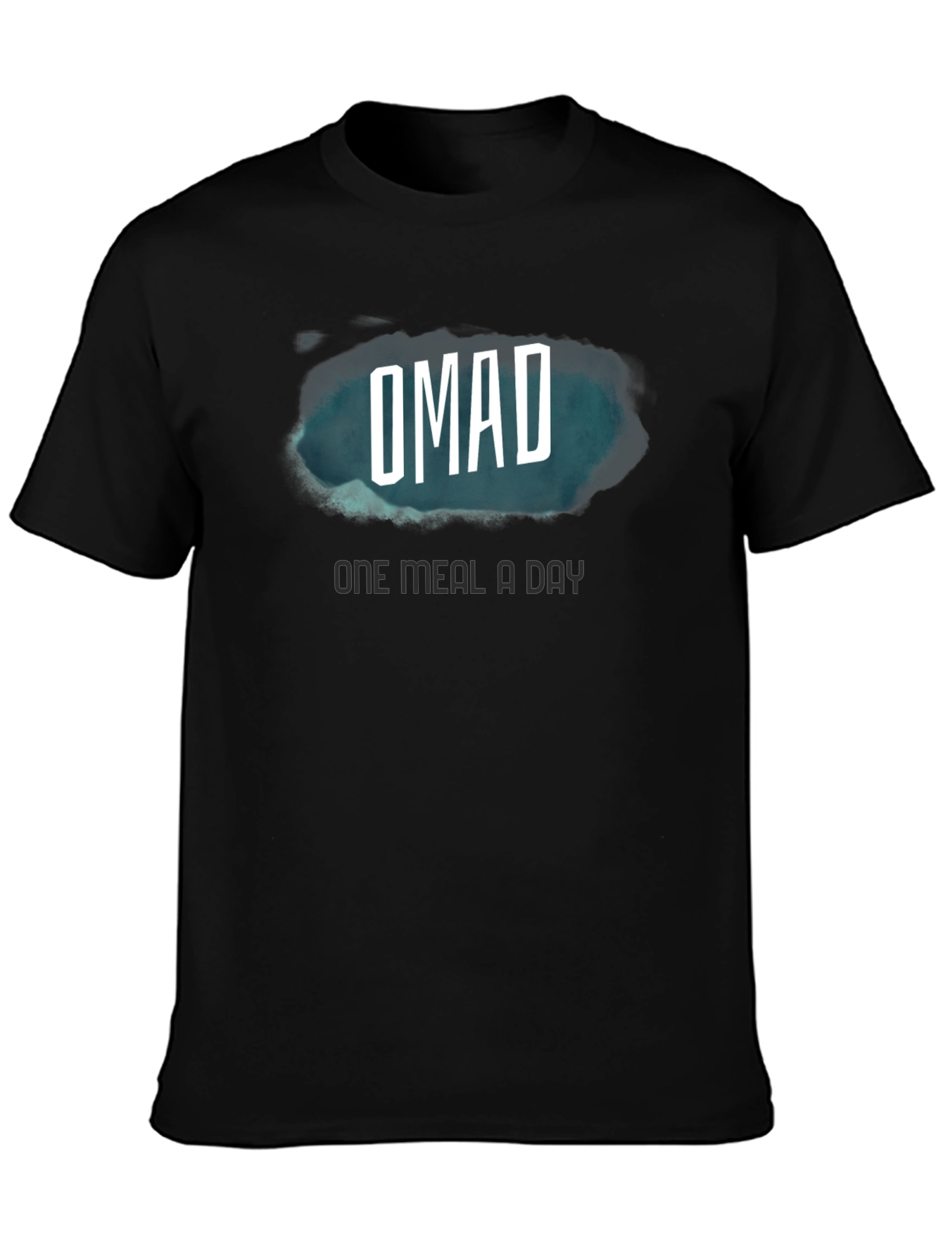 This stylish black t-shirt features the bold acronym "OMAD" (One Meal A Day) in white lettering, set against a dark blue, subtly textured backdrop, giving it a modern, edgy look. Below the acronym, the full phrase "ONE MEAL A DAY" is printed in a smaller, understated font. Made from what appears to be a soft and comfortable fabric, this tee is perfect for everyday wear, whether you're hitting the gym, running errands, or simply lounging at home. Show off your lifestyle choice with this eye-catching and conversation-starting shirt. Its classic fit makes it a versatile addition to any wardrobe.