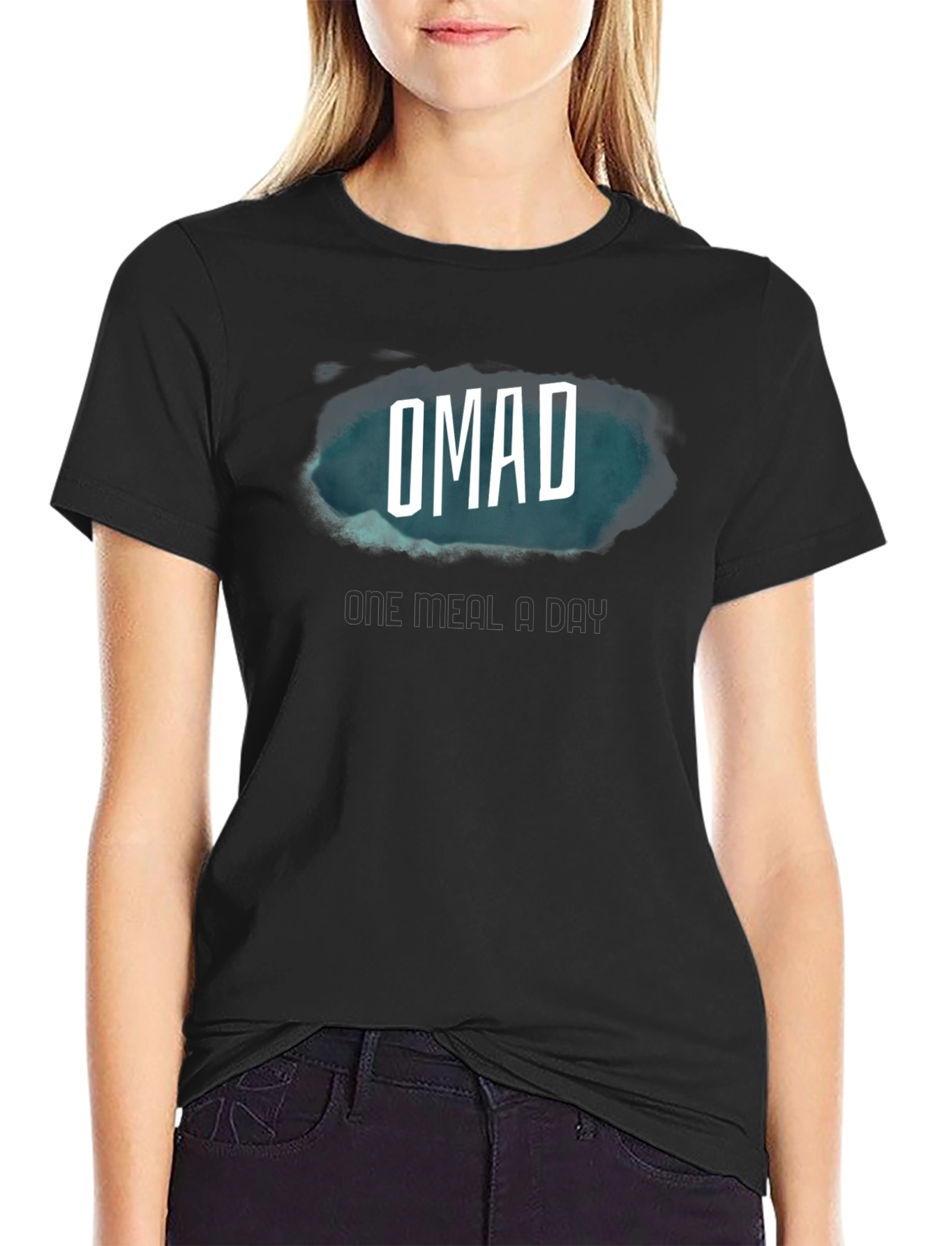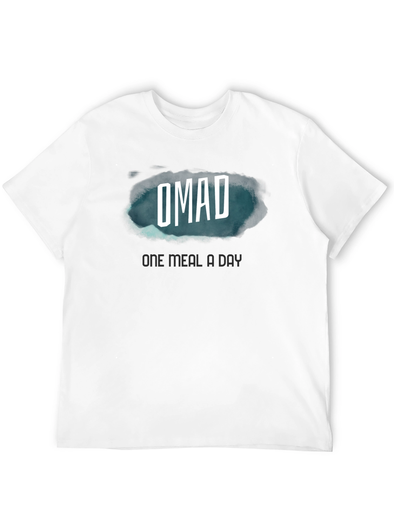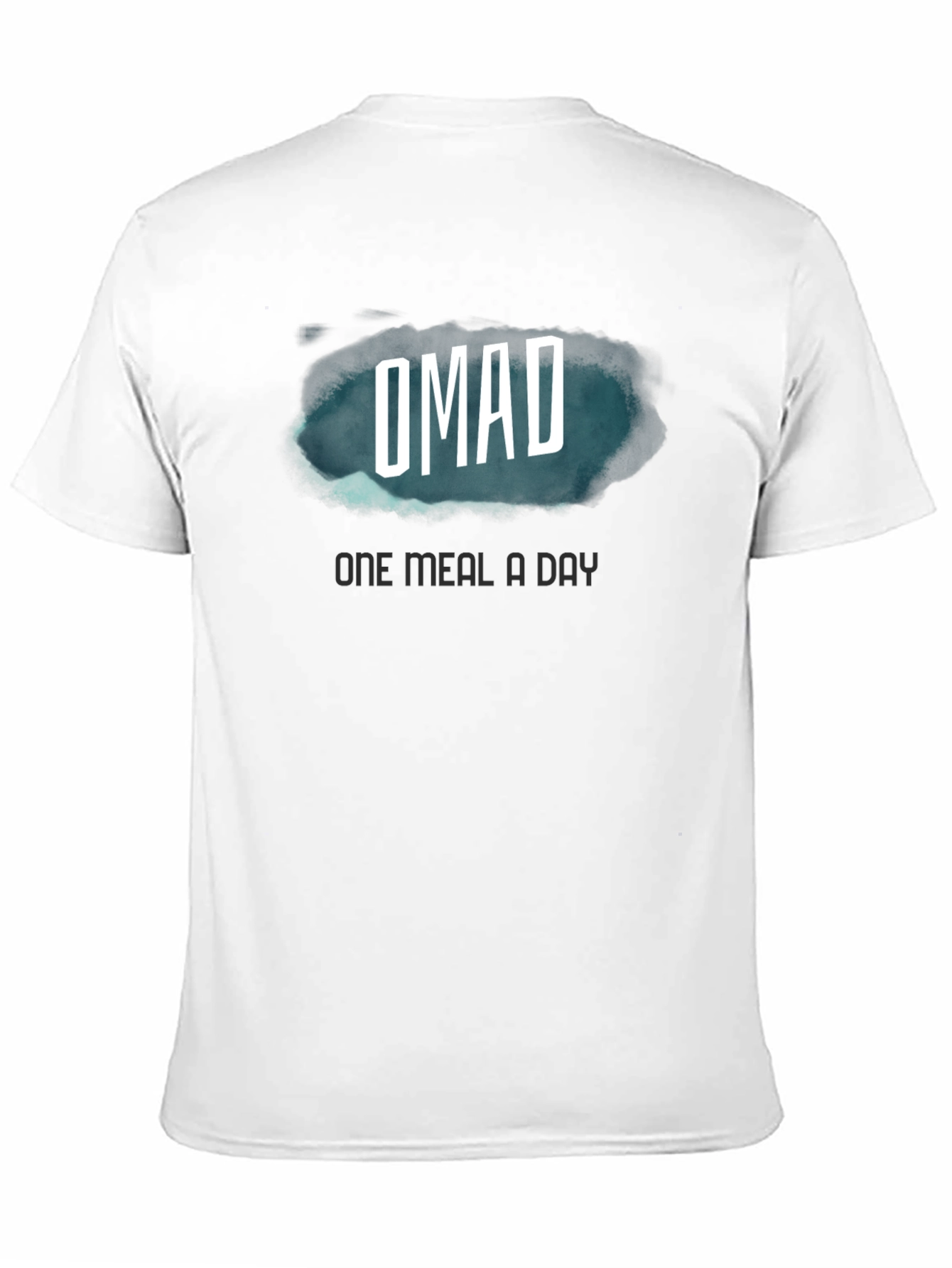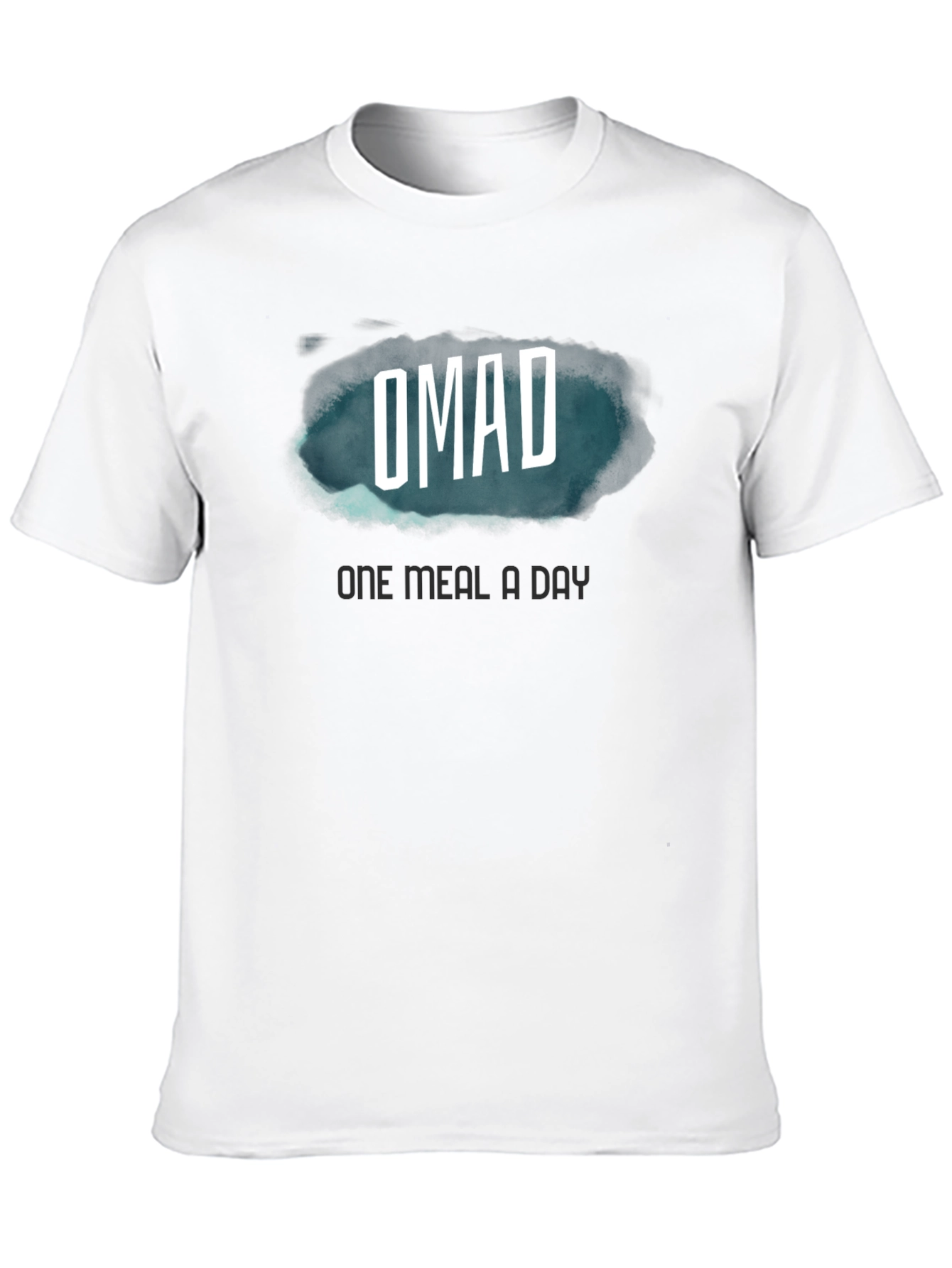 This stylish black t-shirt features the bold acronym "OMAD" (One Meal A Day) in white lettering, set against a dark blue, subtly textured backdrop, giving it a modern, edgy look. Below the acronym, the full phrase "ONE MEAL A DAY" is printed in a smaller, understated font. Made from what appears to be a soft and comfortable fabric, this tee is perfect for everyday wear, whether you're hitting the gym, running errands, or simply lounging at home. Show off your lifestyle choice with this eye-catching and conversation-starting shirt. Its classic fit makes it a versatile addition to any wardrobe.