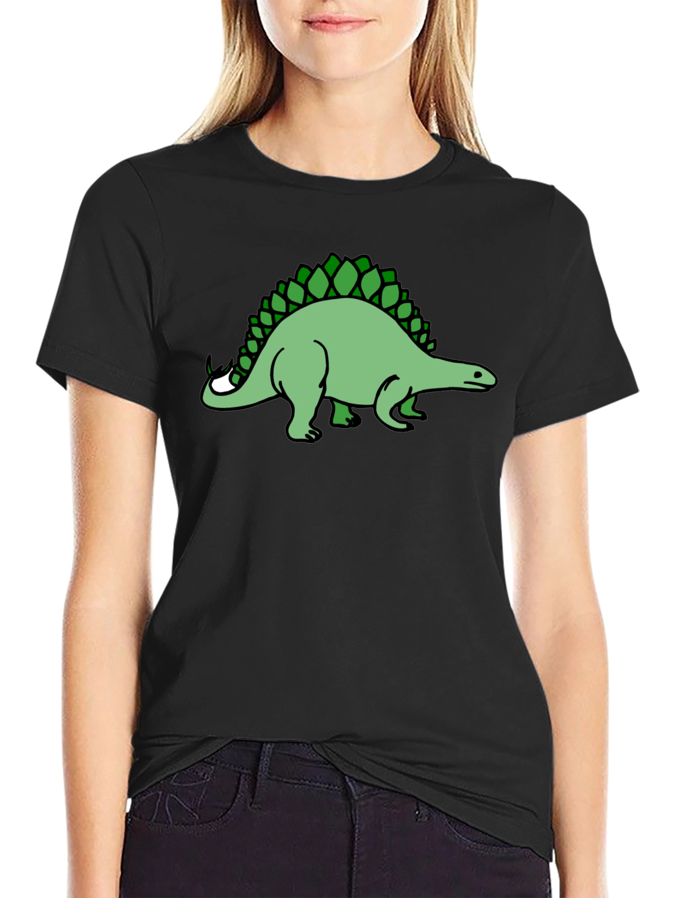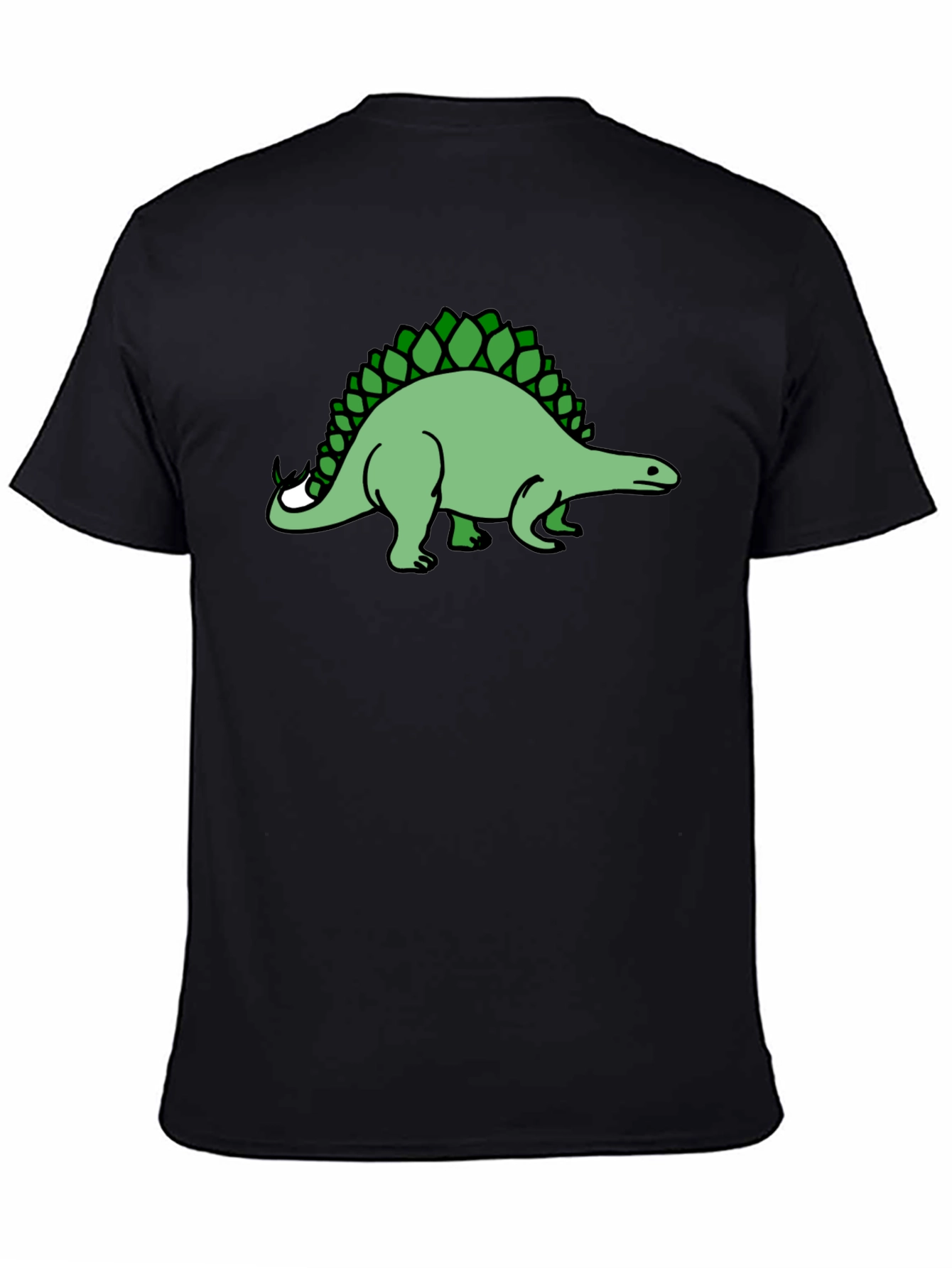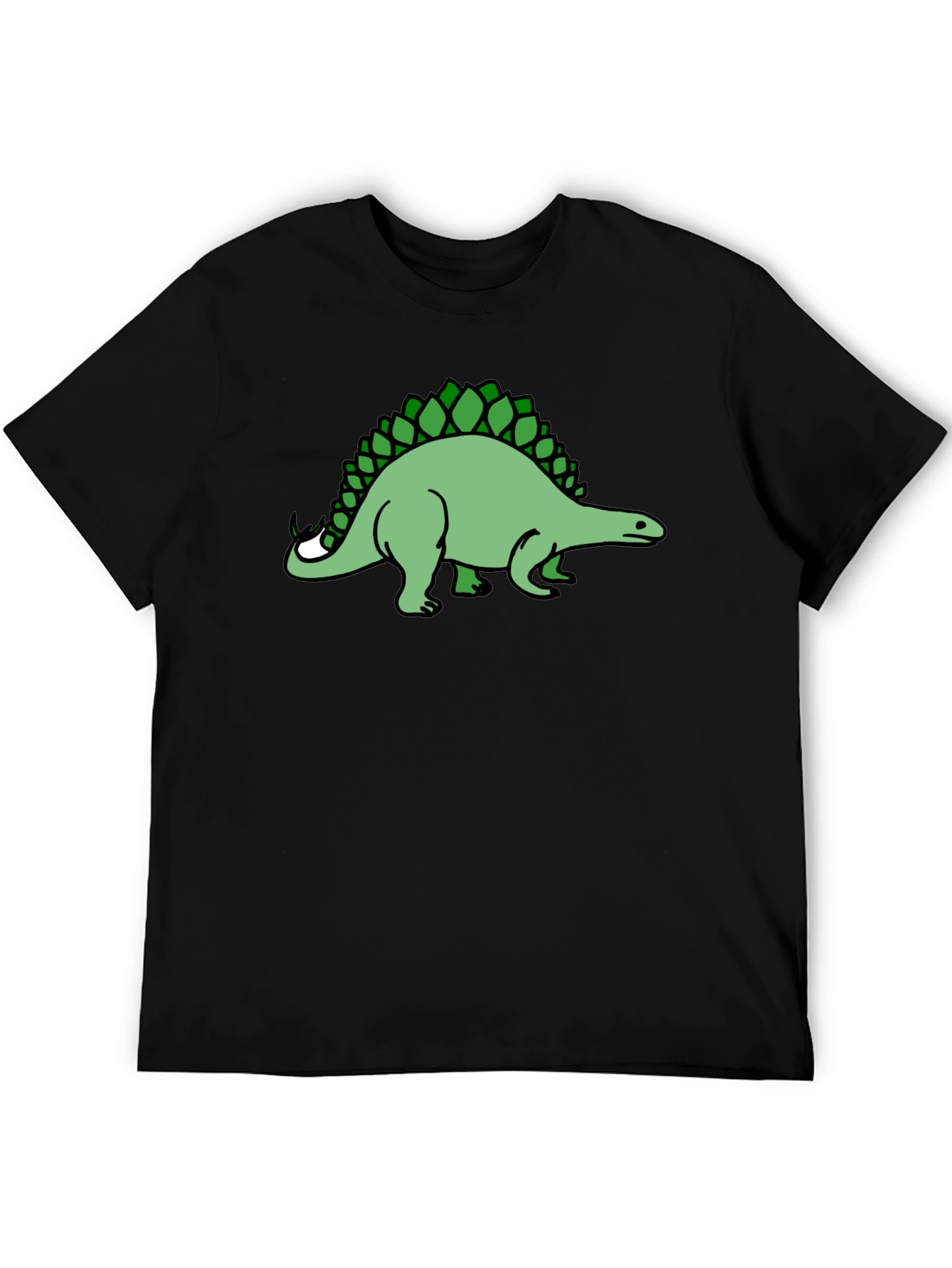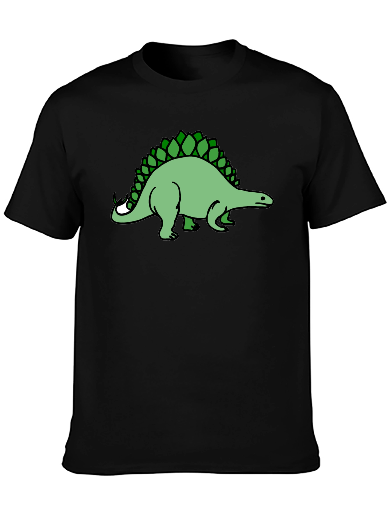 Roar into style with this unique Stegosaurus graphic tee! This black t-shirt features a playful cartoon-style stegosaurus in shades of green, complete with a cheeky eye and distinctive dorsal plates. Made from what appears to be soft, breathable cotton, this shirt offers both comfort and style. The design is ideal for dinosaur enthusiasts or anyone looking to add a touch of whimsy to their wardrobe. Wear it casually with jeans, shorts, or joggers for a fun, everyday look. Perfect for casual outings, school, or simply lounging at home, this tee is sure to spark conversations and bring a smile to faces.