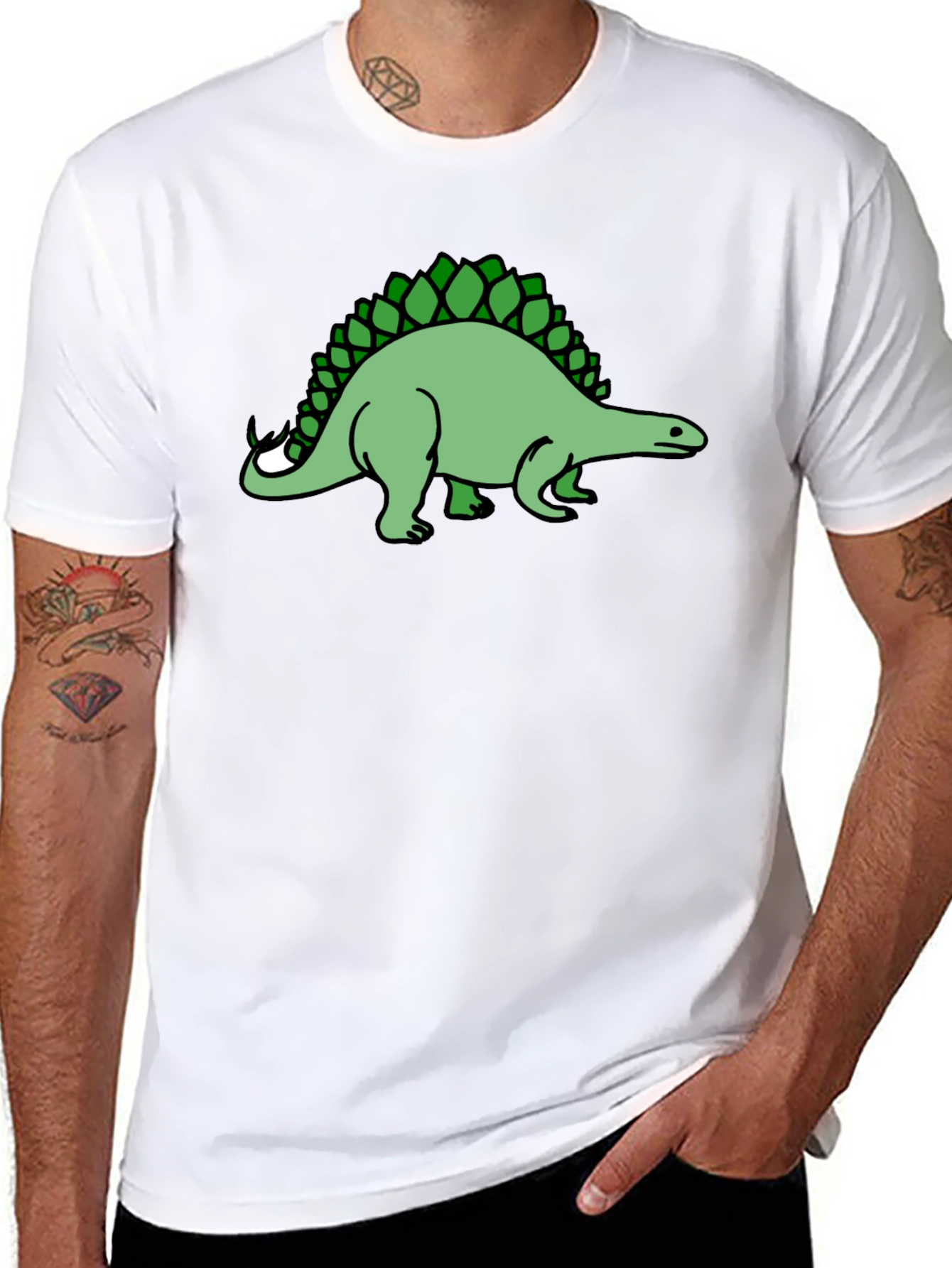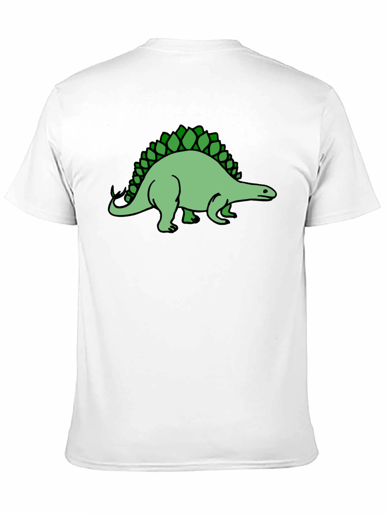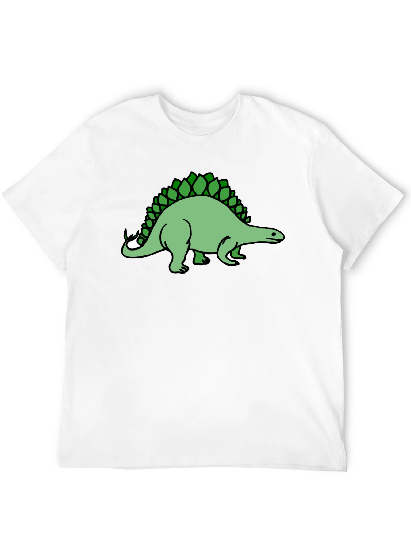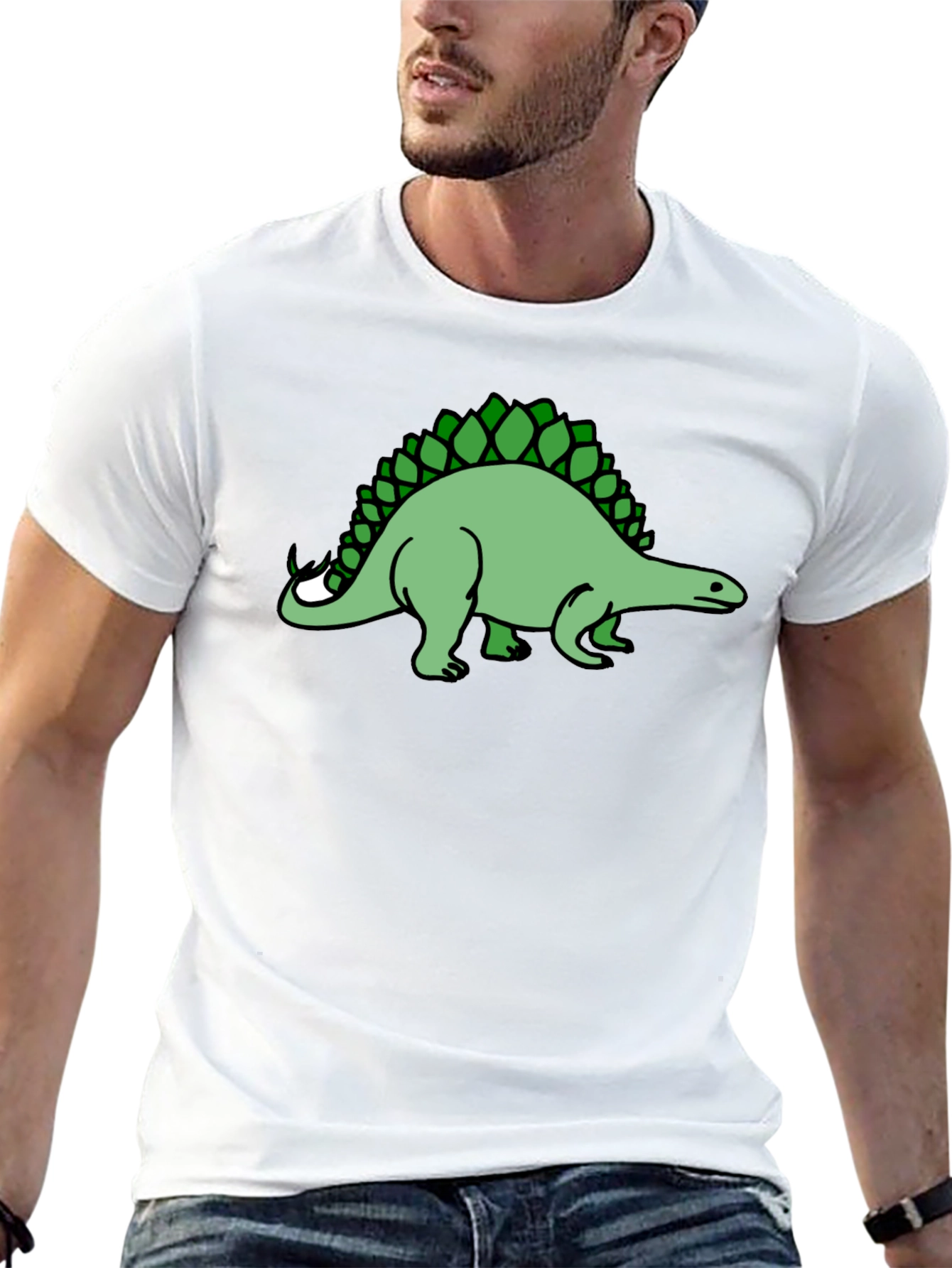 Roar into style with this unique Stegosaurus graphic tee! This black t-shirt features a playful cartoon-style stegosaurus in shades of green, complete with a cheeky eye and distinctive dorsal plates. Made from what appears to be soft, breathable cotton, this shirt offers both comfort and style. The design is ideal for dinosaur enthusiasts or anyone looking to add a touch of whimsy to their wardrobe. Wear it casually with jeans, shorts, or joggers for a fun, everyday look. Perfect for casual outings, school, or simply lounging at home, this tee is sure to spark conversations and bring a smile to faces.