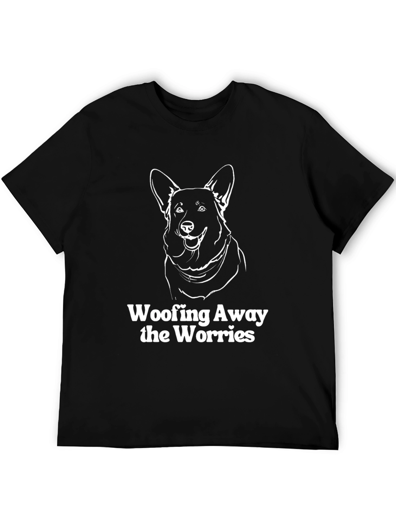 Show off your love for dogs with this stylish black t-shirt. The shirt features a cheerful outline of a dog's face, complete with a happy expression. Below the graphic, the words "Woofing Away the Worries" are printed in bold white lettering. Made from a comfortable-looking fabric, this tee is perfect for casual wear. It's an ideal choice for dog lovers who want to express their passion and spread positive vibes. Dress it up with a jacket or keep it casual with jeans - you'll be turning heads!